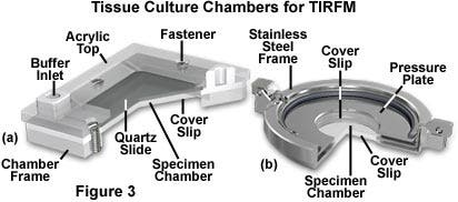As depicted in Figure 3, the specimen chambers contain the aqueous buffer solution necessary to maintain the cultured cells. This solution is sandwiched between the substrate surface and a glass coverslip, which are separated by a Neoprene or Teflon spacer. Teflon rings are commercially available, having thicknesses ranging upwards from 50 micrometers. The buffer solution depth must be quite thin if high-magnification objectives having large numerical apertures and short working distances are to be employed. In many cases, the downward pressure of the glass prism upon the substrate plate may be adequate to seal the specimen chamber without additional clamping, but many chamber designs (Figure 3) include mechanisms to secure the substrate and glass coverslip.