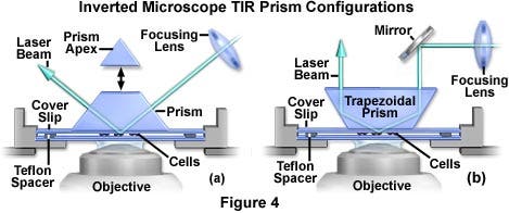 In cases where a prism is employed (as opposed to a glass block) to achieve total internal reflection (see Figure 4(a)), the maximum incidence angle is obtained by introducing the laser beam from the horizontal direction. For standard glass (having a refractive index of 1.52), the maximum incidence angle is 73 degrees for a right angle prism and 79 degrees for an equilateral prism. Phase contrast and other transmitted light techniques are not compatible with this configuration because the upper surface of the triangular prism is not flat. However, custom truncation and polishing of the prism top (presented as an option in Figure 4(a)) produces a surface that can easily pass incident light from above by an inverted microscope condenser system.