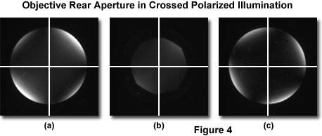 The final step in polarized light microscope alignment is to adjust the condenser aperture diaphragm so the bright outer regions of the polarization cross that are visible at the edge of the objective aperture are blocked. Figure 4(b) illustrates a properly adjusted condenser diaphragm. This step dramatically improves the extinction factor of the microscope optical system, and the field will appear maximally dark when viewed in orthoscopic mode (without a Bertrand lens or focusing telescope). After the microscope has been aligned and the polarization axes calibrated, it is ready for quantitative analysis of birefringent specimens.