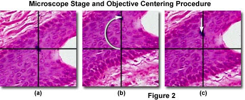 Before inserting the polarizer and analyzer, the 360-degree circular rotating stage should be centered to the 10x objective so specimens will remain in the exact center of the viewfield when they are being rotated. Centering of the stage and objectives is also an important step for quantitative analysis of birefringence and optical path differences. A majority of the circular microscope stages pivot on three adjustable pins, one at the front of the stage for correct positioning and the other two equally spaced at 120-degree angles near the rear of the stage. The stage can be centered with minute adjustments to the rear pivot pins by turning the centering screws. Start by locating a small circular feature on a relatively simple brightfield specimen in an area devoid of other distracting structures. Next, relocate the chosen feature to the center of the viewfield in the eyepiece crosshairs (see Figure 2(a)). Rotate the stage through 180 degrees until the centered specimen feature is overlapped by one of the vertical eyepiece crosshairs (Figure 2(b)). Using the pivot screws, relocate the specimen feature to a distance approximately half way back to the crosshair center (Figure 2(c)). Finally, move the specimen feature back to the center of the crosshairs (Figure 2(a)) and repeat the alignment sequence. After a few cycles, the specimen feature should be centered in the viewfield as the stage is rotated.