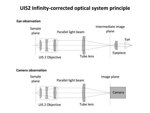 Infinity-corrected optics make it easier to add or remove intermediate components in the parallel rays between the objective and the tube lens. Users can freely add prisms and sliders without affecting optical performance, something finite optical systems cannot offer. All objectives have a 45 mm parfocal length with standardized threads, and the focal length of the tube lens is only 180 mm, enabling compact integration into custom assemblies.
