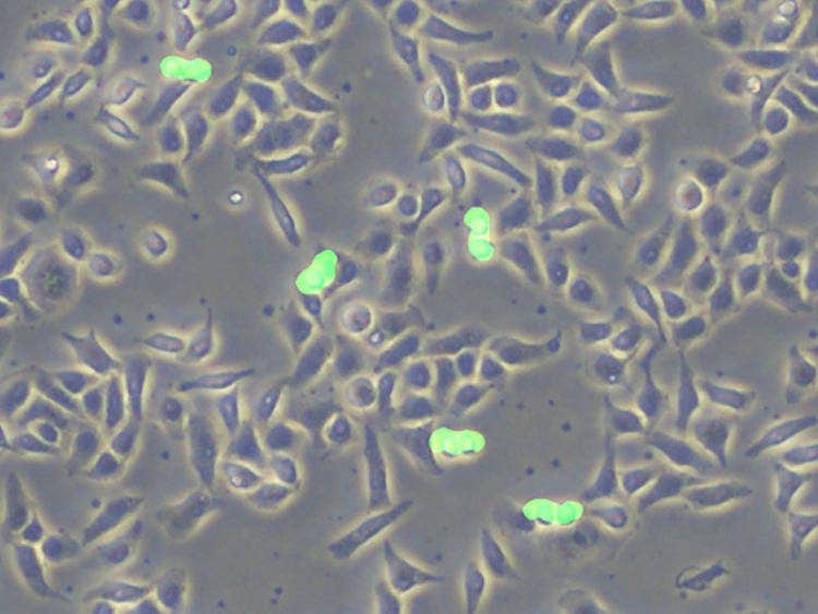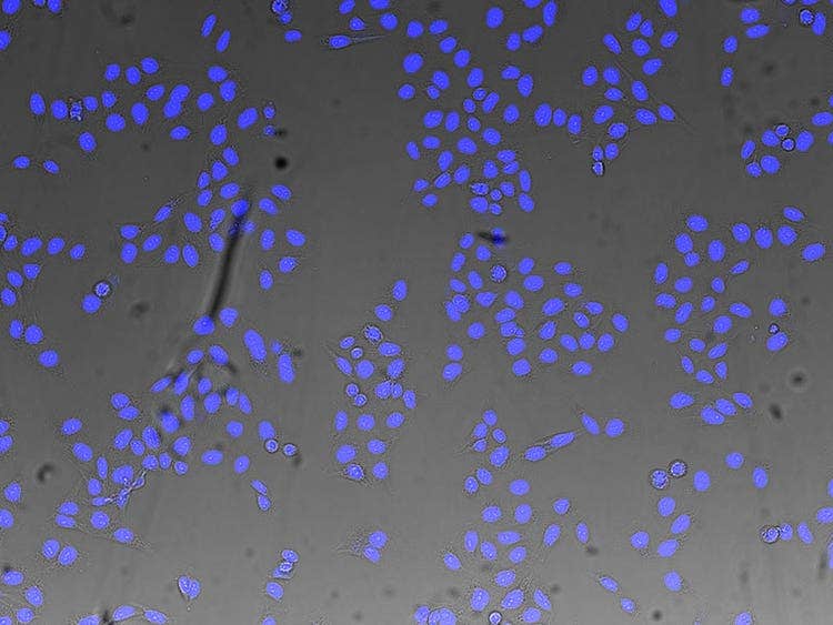 (green) fluorescence image of nuclei, (blue) nuclei detected from brightfield image by TruAI technology