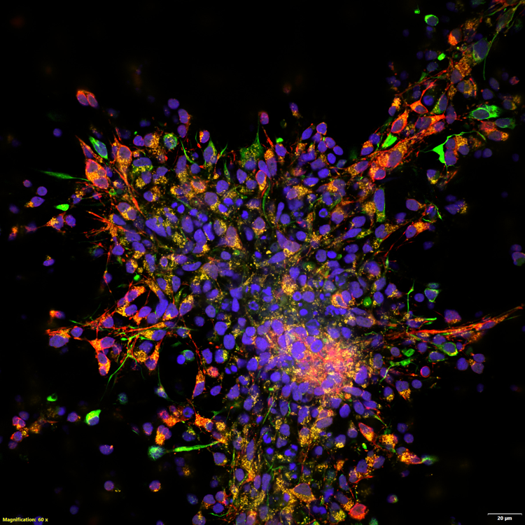 Neurons. DAPI (blue), ATP5 (yellow), vimentin (red), MAP2 (green).