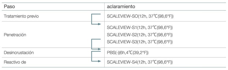 Se adquirieron o fabricaron SCALEVIEW-S0, S1, S2, S3, S4, y la solución desincrustante (FUJIFILM Wako Chemicals) (3). La Tabla 1 muestra el protocolo original usando estos reactivos.