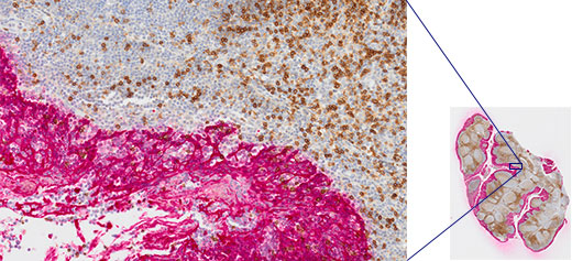 Amígdala CD3 (rm), ImmPRESS Reagent (HRP) anti-ratón IgG con ImmPACT DAB (marrón), AE1/AE3(m) ImmPRESS (AP) (HRP) anti-conejo IgG con ImmPACT Vector Red (rojo). Contratinción con hematoxilina QS (azul).