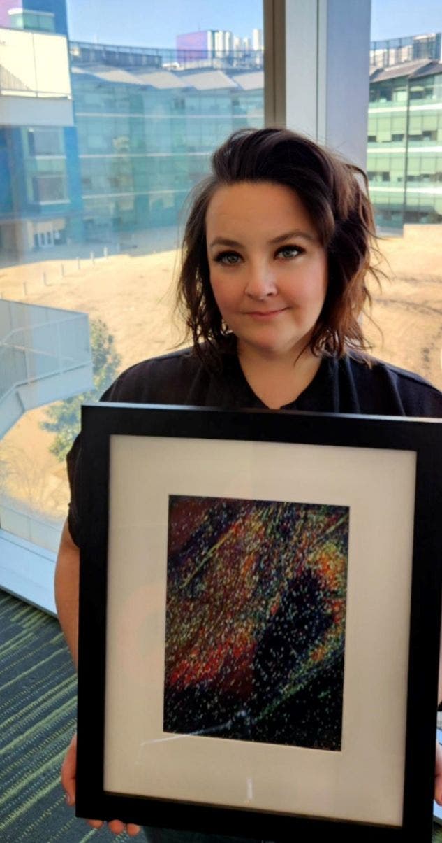 La Dra. Stephanie Shiers sosteniendo la imagen de portada enmarcada.