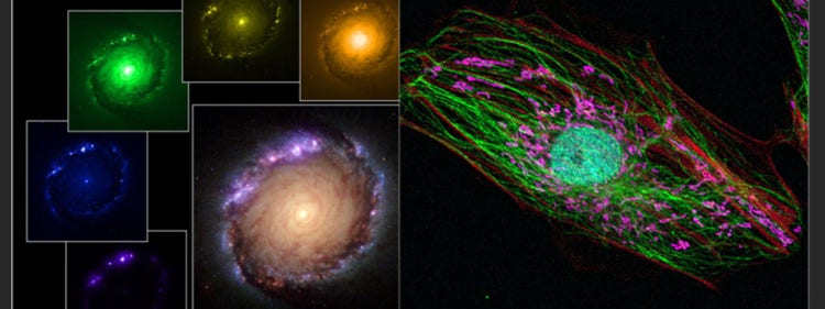 Figura 7: Aplicaciones espectroscópicas comparadas en la astronomía y en la microscopía. Arriba: Separación espectral de la luz emitida por diferentes cuerpos celestes dentro de una galaxia. Abajo: Separación espectral de cuatro estructuras diferentes dentro de una celda. Créditos de las imágenes principales: NASA, ESA, Dan Maoz (Universidad de Tel Aviv, Israel y Universidad de Columbia, EE. UU)