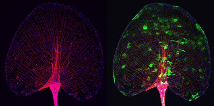 Esta imagen es un recorte de una mosca de la fruta, mostrando un órgano similar al estómago de los mamíferos. La zona azul es el núcleo teñido con DAPI y la zona roja es la fibra muscular teñida con faloidina. La segunda imagen es una "célula de parche" con marcado GFP.