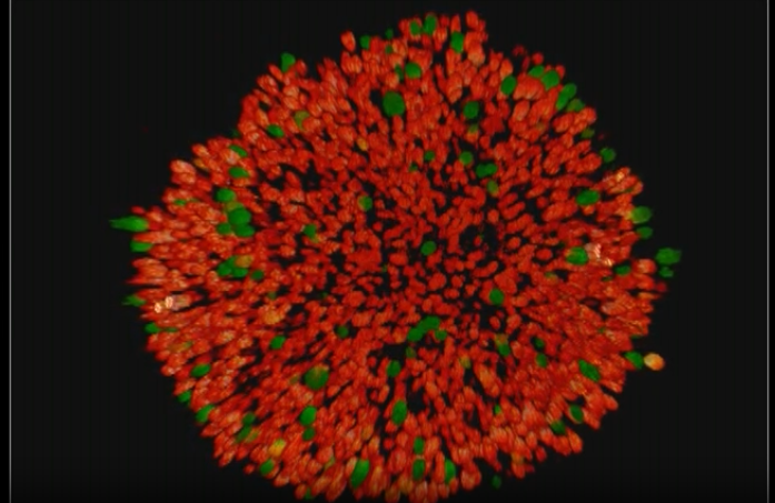 Esferoide de células HeLa marcado con DAPI (cian, núcleos celulares) y AlexaFluor790 (magenta, Ki-67). El procesamiento de imágenes del volumen completo del esferoide se efectuó con NIR de 785 nm, aunque solo fue posible la observación del área superficial de los núcleos celulares con un láser de 405 nm.