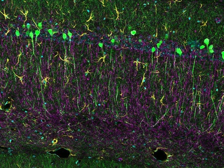 Unidad neurovascular del hipocampo de un ratón. Azul; DAPI (núcleos celulares), verde; GFAP AF488. Astrocitos, amarillo; pericitos DsRed, magenta; colágeno IV AF647, membrana basal de vasos sanguíneos, gris; AQ-4. Canal de agua con astrocitos.