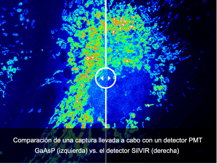 La eficacia del detector en la detección fotónica es superior a la de los detectores PMT GaAsP usados tradicionalmente para el procesamiento de señales confocales de alta sensibilidad con todas las longitudes de onda. Esto permite que el detector SiLVIR pueda ofrecer una relación señal-ruido (S/N) superior para dar vida a las señales de fluorescencia más débiles.