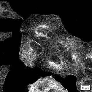Células NIH3T3 marcadas con Hoechst (azul), β-tubulina–AF555 (verde), CPCA–HSP60–AF647 (magenta) y fibrilarina–AF568 (gris). Barra de escala: 5 μm. Muestra por cortesía de: EnCor Biotechnology Inc.