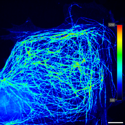 Cultivo de células Cos-7: Tubulina (Alexa Fluor 488). Cambie fácilmente de una imagen confocal a una imagen de mayor resolución utilizando el objetivo LUPLAPO25XS y el algoritmo de superresolución TruSight SR.