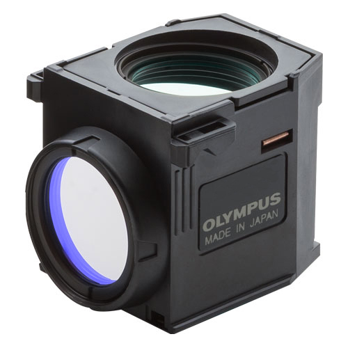 CFP fluorophore filter set with bandpass emission for IX83/73/53 and BX63/53/43 microscopes. Standard 25mm-diameter filter set. Excitation: 425-445nm, Dichromatic Mirror: 450nm, Emission: 460-510nm. Common fluorophores: CFP.