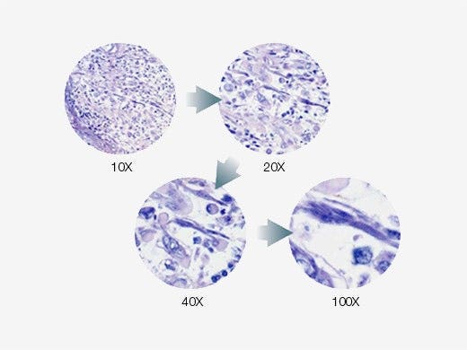 Vea un 31 % más de su muestra de una sola vez con el campo de visión líder del sector de nuestro ocular FN26.5. Esta visión más amplia, con la misma calidad óptica que el FN22 estándar, reduce los movimientos manuales necesarios para ajustar el portaobjetos y explorar completamente la muestra, lo que permite realizar análisis y tomar decisiones más rápidamente.