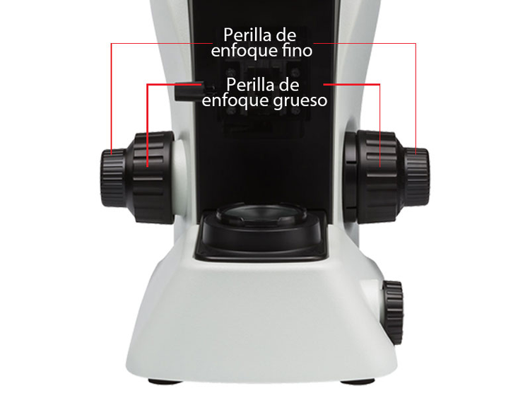 - Mandos coaxiales de fácil acceso en cada lado del microscopio, para realizar ajustes de enfoque micrométrico o macrométrico rápidamente.