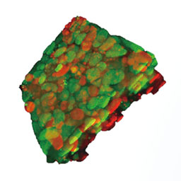Procesamiento de imágenes de intervalo de tiempo en 3D de esferoides con el microscopio confocal FLUOVIEW FV3000: Observación continuada durante 48 horas de la citotoxicidad mediada por células dependientes de anticuerpos (ADCC)