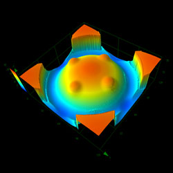 Le microscope à balayage laser 3D LEXT d’Olympus permet l’imagerie en trois dimensions sans contact de la forme concave ou convexe d’un masque à échelle de gris en haute résolution et avec un contraste élevé. Grâce aux lentilles d’objectif avec des ouvertures numériques élevées et au système optique conçu pour obtenir un rendement maximal à partir du laser de 405 nm, le microscope LEXT peut capturer le profil de pentes irrégulières avec précision et produire des profils 3D fiables et reproductibles (Figure 1). En plus de mesurer la forme des échantillons, il est également possible de visualiser clairement les irrégularités mineures en utilisant l’interférence différentielle du laser.