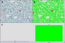 The image (A) was acquired using a VS120 BF with a VC50 camera at 10x magnification. The image was subsequently analyzed using the VS-Analysis solution (B) to analyze the percentage of red stained bone particles against the green stained protein matrix. The mean value of 10 sections, each 4cm2 was calculated.
