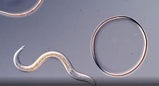 Ce nématode déterminé (ver rond) fait de son mieux pour entrer dans une bulle d’air située sur la lame. Les nématodes sont plus nombreux que tous les autres animaux de la planète et représentent environ 80 % de tous les animaux existants. Ces petits vers abondants jouent un rôle important dans notre environnement en accélérant le processus de décomposition. En se nourrissant, ils recyclent dans le sol les minéraux et autres nutriments provenant des bactéries, des champignons et des plantes. Les nématodes sont également sensibles et réactifs aux changements de l’environnement causés par la pollution.