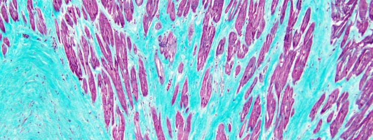Coupe d’un cœur humain endommagé colorée au trichrome de Masson.