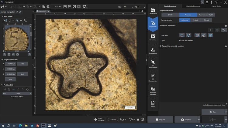 Images 3D mises au point : La fonctionnalité d’imagerie à profondeur de champ étendue permet d’obtenir facilement des images de vos échantillons en 3D et parfaitement mises au point. Le logiciel contrôle le microscope afin d’acquérir en série des images de votre échantillon à différents plans focaux. Si votre échantillon est grand, la fonctionnalité de panorama vous permet d’obtenir des images en mode EFI (profondeur de champ étendue), dont la profondeur de champ est plus grande que le champ d’observation du microscope. Avec le logiciel PRECiV DSX, vous pouvez également analyser hors ligne les images obtenues en mode EFI et en mode panorama, et utiliser des images dont vous disposez déjà.