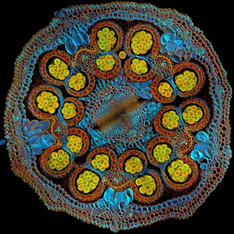 Coupe transversale d'une fleur d'aster « Cosmic Orange » avec des grains de pollen mûrissant à l'intérieur des anthères. Capturé par Igor Siwanowicz (États-Unis, 2024).