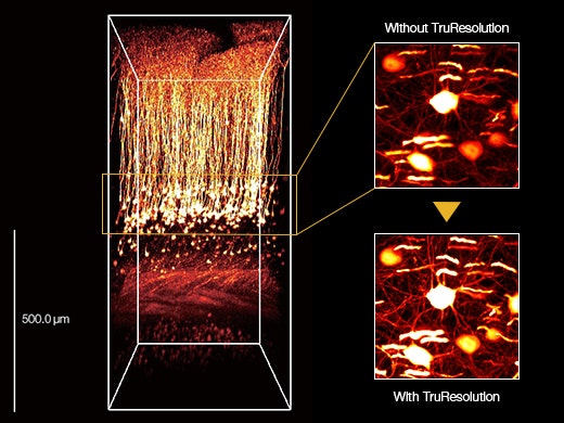 Maximisez les performances d’imagerie en profondeur de votre microscope multiphotonique grâce aux objectifs TruResolution. Une bague de correction automatisée assure la compensation de l’aberration sphérique à toutes les profondeurs pour produire des images haute résolution lumineuses, quelle que soit leur position dans la pile d’images.