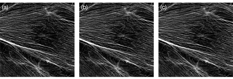 Figure 16 : Images acquises à l’aide du détecteur SilVIR et d’un scanner résonnant 1K. Figure 16(a) : Image prise à 130 ms/image sans moyennage. Figure 16(b) : Moyennage de deux prises de vue à 262 ms/image. Figure 16(c) : Moyennage de quatre prises de vue à 522 ms/image. Comme le détecteur SilVIR peut acquérir des images à rapport signal/bruit élevé avec un scanner résonnant, une petite quantité de moyennage est suffisante pour obtenir une image de haute qualité. Cela améliore l’efficacité de l’acquisition d’images.