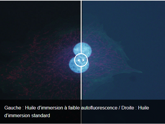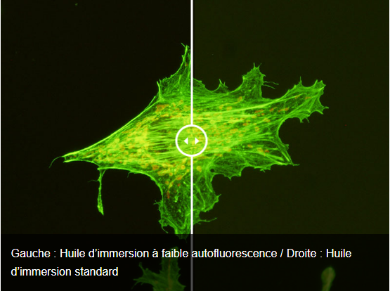 Gauche : Huile d’immersion à faible autofluorescence / Droite : Huile d’immersion standard