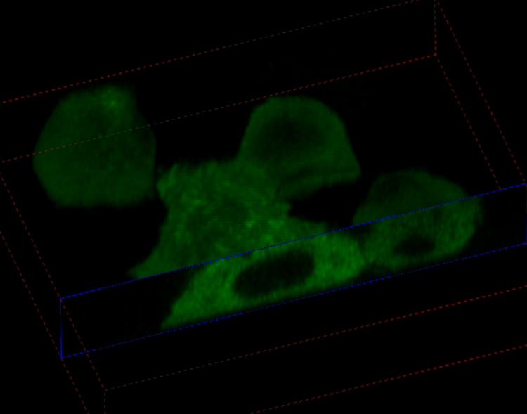 Photostimulation en imagerie à intervalles : la lésion au laser a été réalisée sur des cellules C2C12. La pseudo-couleur verte représente l’application d’un bain de FM 1-43. L’image a été acquise avec un scanner galvanométrique de 2 μs et un objectif UPLSAPO60XOHR. Un laser de 405 nm a été utilisé pour la photolésion et un laser de 488 nm a été utilisé pour l’imagerie. Échantillon gracieusement fourni par : Daniel Bittel et Jyoti Jaiswal, Center for Genetic Medicine Research, Children’s National Research Institute.