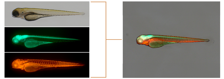 - En outre, la caméra vous permet de facilement superposer des images de fluorescence et en fond clair avec une précision au pixel près étant donné que vous utilisez le même capteur pour les deux méthodes d’observation. Vous pouvez ainsi localiser avec précision les signaux fluorescents et identifier plus facilement les structures morphologiques de votre échantillon qui sont associées à ces signaux.
