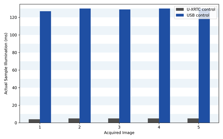 Comparé au contrôle USB classique (bleu), le contrôleur temps réel U-XRTC (gris) réduit le temps d'illumination effectif de l'échantillon jusqu'à 25 fois, limitant ainsi les photodommages tout en maintenant la vitesse expérimentale.
