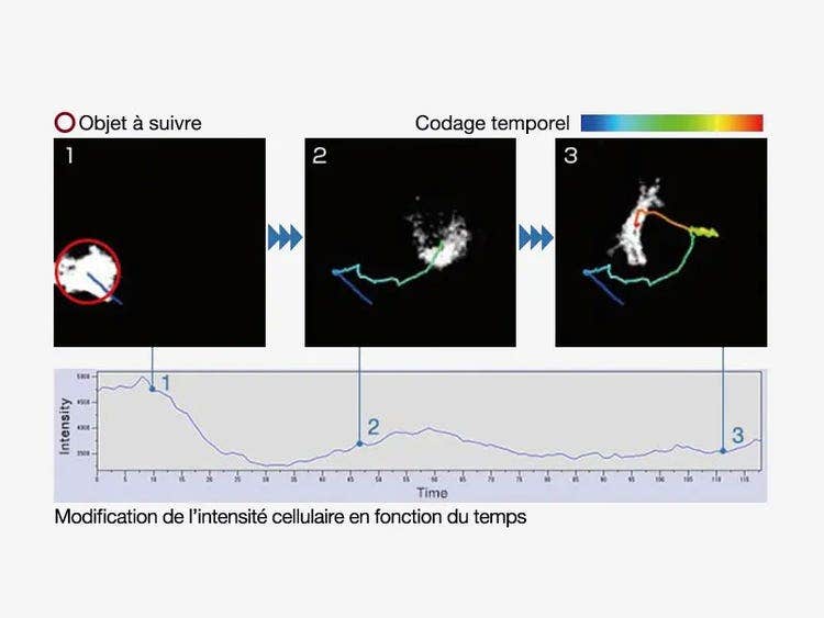 Les fonctionnalités avancées, telles que le suivi, la numération et la mesure des objets, le kymographe et la déconvolution 2D en temps réel améliorent l’identification des objets.