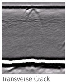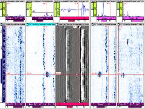 The Shear Wave transducers are common mono-crystal (composite) ultrasonics transducers fitted into 45, 60, 0r 70 degree wedges. In order to facilitate analysis of the often large scan area, B-scan (side view) imaging is employed, colors are based on amplitude.
