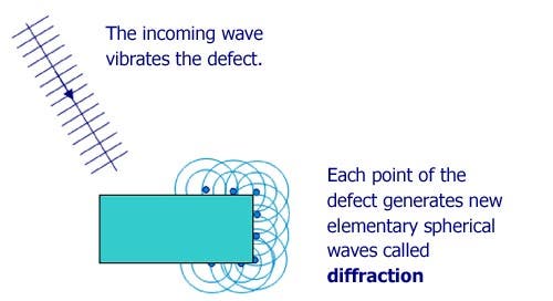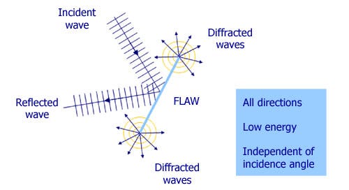 Tofd utilizes highly dampened transducers set into refracted longitudinal wave wedges to produce a very wide beam L-wave to cover the area of interest. Unlike Pulse-Echo it utilizes a pair of transducers in pitch-catch configuration (1 send, 1 receive probe). Detection of defects is based on Huygens's principal- basically when an object is hit with a wave of energy the object will vibrate, thus emitting diffracted energy in all directions as well as reflected energy. These Omni-directional diffracted waves will be picked up by the receive probe.