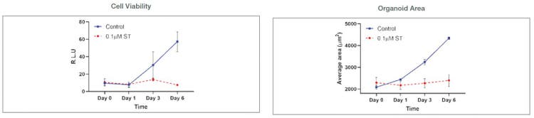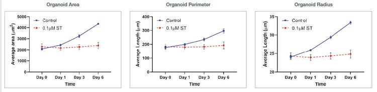 Organoid size-related parameters (area, perimeter, and radius) increased over time in the untreated organoid culture. 0.1 μM ST treatment induced cell and organoid death. Organoid growth was completely inhibited, and there was no significant organoid size increase in the ST-treated organoids.