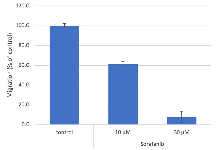 Cell migration was determined by subtracting the levels of confluency at the start of treatment from those after 48-hour treatments. Cell migration was found to be significantly inhibited in proportion to the sorafenib concentrations.