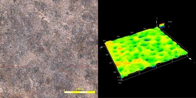Quando un'azienda automobilistica ha richiesto al suo fornitore d'acciaio di misurare le irregolarità delle piastre in acciaio in alta risoluzione, il microscopio OLS4100 ha dimostrato sia un'elevata risoluzione, sia la capacità di misurare accuratamente l'irregolarità delle superfici. Di seguito è rappresentata la misurazione delle irregolarità delle piastre in acciaio ottenuta utilizzando il microscopio OLS4100 a confronto con le immagini scattate con la macchina per misurare l'irregolarità della superficie di contatto:
