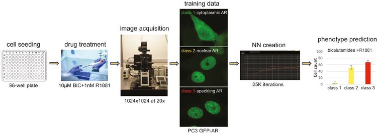Upon activation, cytoplasmic AR translocates to the nucleus where it localizes to transcriptionally active sites, which can be visualized as a distinct speckling pattern using confocal microscopy. To predict the AR dynamics, we first generated a NN that detects cell nuclei without using nuclear stains. Then we classified cells based on GFP-AR nuclear translocation and transactivation (speckling) status―both essential assay readouts to test compounds for their ability to target AR. Finally, we demonstrated that our NN workflow successfully predicts these critical AR phenotypes without nuclear staining.