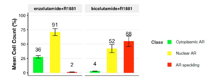 Treatment with the second-generation antiandrogen enzalutamide led to a prominent cytoplasmic AR (class 2) population with little or no speckling AR (class 3), suggesting an effective blockade of ligand-induced AR activation. In contrast, the older, less effective antiandrogen bicalutamide led to a notable shift toward active AR (class 3), suggesting its inability to effectively block 1nM R1881-induced AR activation. These data confirm previous studies2.
