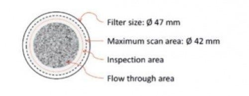 - Estrapolazione del numero di particelle: Un'area definita sul filtro a membrana viene scansionata e controllata relativamente alle particelle. Queste aree possono includere la dimensione del filtro (area totale del filtro), l'area di passaggio (area del filtro coperta da particelle), l'area di scansione massima (area massima potenziale da scansionare per l'ispezione) e l'area di ispezione (area di scansione attuale definita dall'utente).