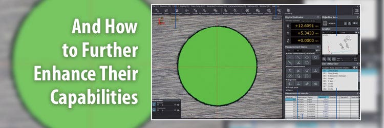 Un microscopio di misura può inoltre essere dotato di un display digitale (DRO - digital readout) o di un software di supporto per la misura per aumentare le proprie funzionalità. L'uso di questi strumenti permette di portare il microscopio a un livello superiore. Senza un display digitale o un software, il microscopio di misura fornisce le coordinate di ogni punto misurato e lascia tutti i calcoli all'operatore. Nel caso di una forma semplice come il cerchio, la misura del diametro può risultare complicata in quanto si deve determinare esattamente il centro per determinarlo. Attraverso un adeguato software è possibile acquisire tre punti del cerchio calcolando istantaneamente il diametro. Supponiamo che il cerchio sia un foro di una componente ed è necessario sapere se il foro si trova nell'esatta posizione. ll software visualizzerà le coordinate del centro del foro potendole usare come riferimento per un punto di inizio della propria componente. L'elenco delle misure possibili è ampio e le funzionalità di questi tipi di misure continueranno a aumentare in rapporto allo sviluppo di nuovi software.