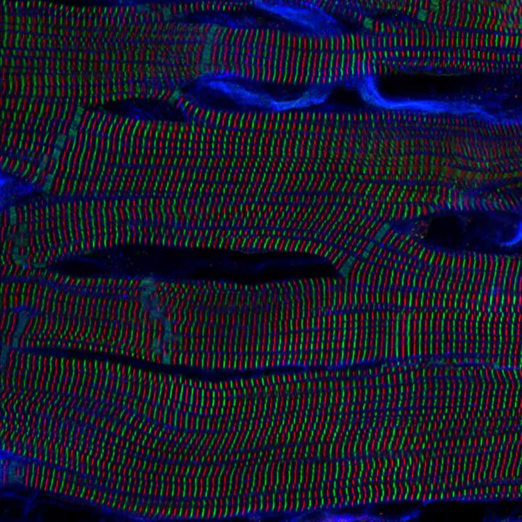 Strutture sarcomeriche all'interno dei cardiomiociti nel cuore di un ratto. Scattata da Kentaro Mochizuki (Giappone).