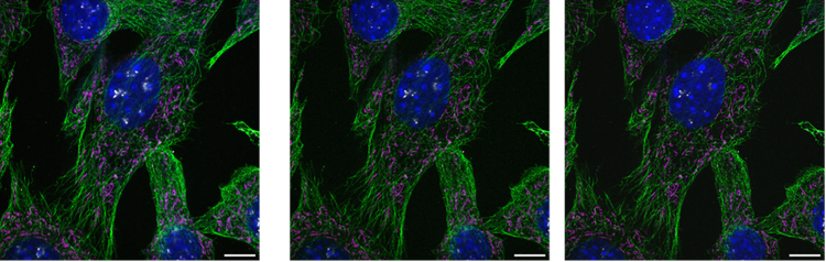 Nell'imaging di cellule live è necessario minimizzare gli effetti sulle cellule vive applicando la più bassa eccitazione luminosa possibile. Pertanto è difficile ottenere delle immagini a fluorescenza con alto SNR. Il TruSight SR fornisce delle immagini ad altissima risoluzione con un migliore SNR in immagini live, eseguendo un'affidabile elaborazione basata sulla deconvoluzione lineare con una potenza del filtro appropriata per le immagini ottenute con segnali di fluorescenza attenuati.