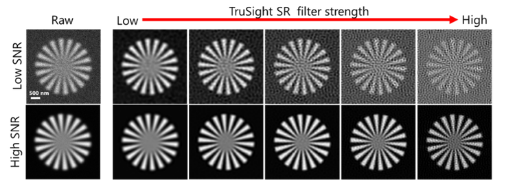 Inoltre il TruSight SR include un algoritmo che determina l'SNR dell'immagine e ottimizza la potenza del filtro. I microscopi sono usati per diversi tipi di applicazioni, pertanto è impossibile determinare l'SNR unicamente in base ai semplici valori statistici (es: varianza o differenza di luminosità) dell'immagine. La ragione risiede nel fatto che è difficile distinguere se la variazione della luminosità nell'immagine è causata dal rumore o dalla struttura del campione. Il TruSight SR sviluppa una tecnologia che seleziona in modo costante l'ottimale potenza del filtro con qualsiasi condizione di imaging. Lo effettua valutando i segnali in base alla forma del campione e in base al rumore generato casualmente dal sensore dell'area dall'immagine acquisita.