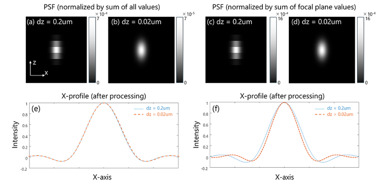 La c) e la d) sono PSF dove il valore di luminanza totale è normalizzato considerando solamente la sezione trasversale di messa a fuoco XY. Con questo metodo di calcolo, cambiare le condizioni di imaging dell'intervallo Z si traduce in un diverso FWHM (full width at half maximum) XY, come illustrato nel grafico (f).