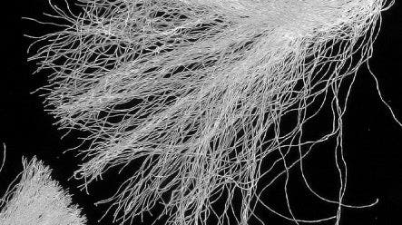 A destra: Immagine di fibre acquisita mediante la luce trasmessa con la cartuccia in campo scuro SZX2-CDF.