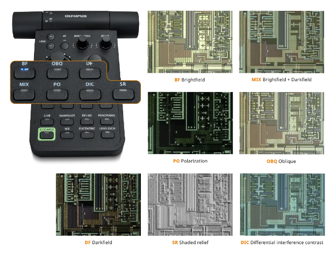 Il microscopio DSX2000 offre sette diversi metodi di osservazione cliccando su un pulsante. Trova le condizioni di osservazione ottimali mediante: campo chiaro (BF), obliquo (OBQ), campo scuro (DF), MIX (campo chiaro + campo scuro), polarizzazione (PO), contrasto interferenziale (DIC) e la nostra speciale modalità shaded relief (SR).