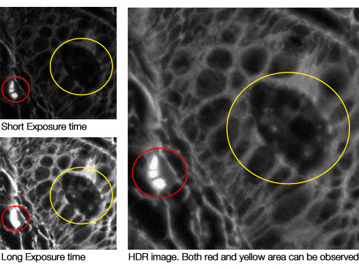 Acquisendo automaticamente numerose immagini a diverse esposizioni la funzione HDR crea un'immagine finale con una gamma dinamica superiore rispetto a quella ottenuta con una singola esposizione. I segnali a bassa intensità sono chiaramente visibili senza sovraesporre le aree illuminate del campione.